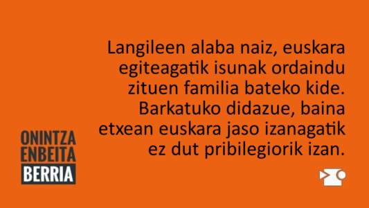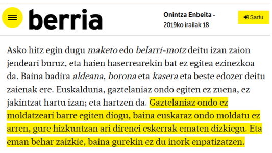 🗨️ #OnintzaEnbeita: «Gaztelaniaz ondo ez moldatzeari barre egiten diogu, baina #euskaraz ondo moldatu ez arren, gure hizkuntzan ari direnei eskerrak ematen dizkiegu» #Berria-ren bidez