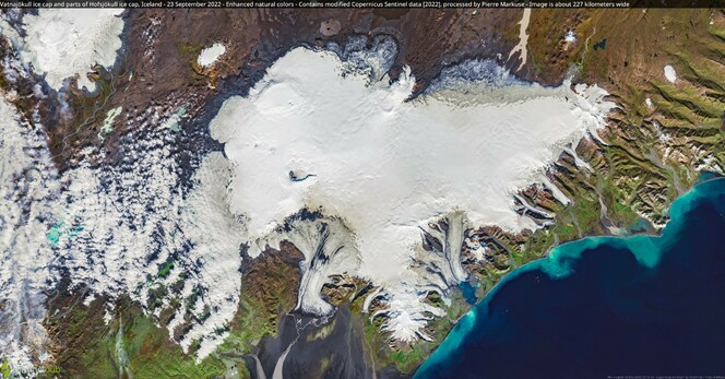 🔵 Vatnajökull ice cap and parts of Hofsjökull ice cap, #Iceland🇮🇸 23 September 2022 #Copernicus🇪🇺 #Sentinel-2🛰️ Full-size ▶️ https://flic.kr/p/2o8B7kn #RemoteSensing #OpenDate #SciComm #Glacier #Vatnajökull #Hofsjökull Image is about 227 kilometers wide
