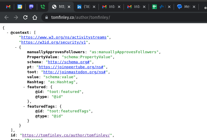 @tomfinley@wptoots.social actually, you are having the #Cloudflare issue on your #WordPress site with #ActivityPub . I just visited your site via my web browser and I am getting JSON when I should be getting HTML.