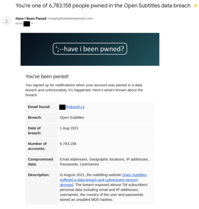 This morning I woke up yet another email from Firefox Monitor that a website I've used before (#OpenSubtitles) has been hacked and as the result user information data (including my info) have been leaked. According to HaveIBeenPwned.com: