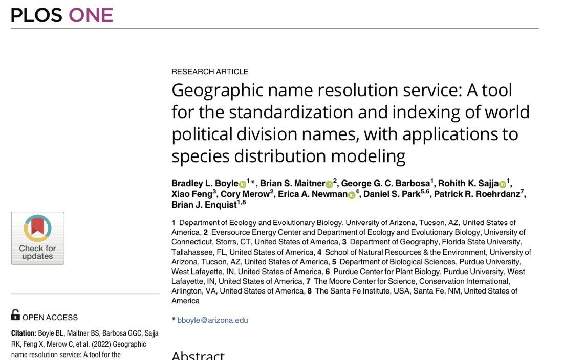 We have a new publication - Geographic name resolution service: A tool for the standardization and indexing of world political division names, with applications to species distribution modeling #OpenScience #OpenTools #Ecoinformatics #GNRS https://journals.plos.org/plosone/article/file?id=10.1371/journal.pone.0268162&type=printable