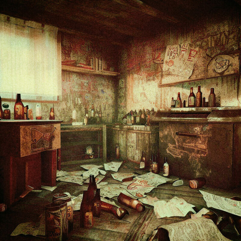 Miejsce: odrapana klitka, graffiti na ścianach, butelki po piwie na podłodze, wszędzie walają się szpargały, m.in. stare „Playboye” i „Almanachy Matematyczne”, stęchły zapach w powietrzu.