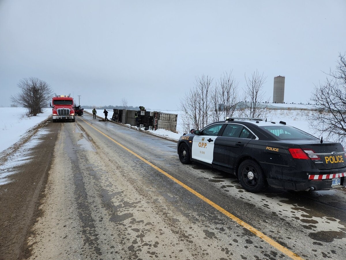 #HuronOPP are on scene with an overturned tractor-trailer on Black's Point Rd west of Huron Rd in @CentralHuron. Truck has a load of pigs on board. Please avoid the area. #OPP ^cs.