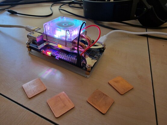 Replaced the weird mushy thermal pad included with the Icy Tower cooler with a proper copper shim and thermal paste on my #orangepi5. Gap between the cooler and the shim is still close to half a millimeter and has now been filled with paste until I get a chance to trim the distance pieces.