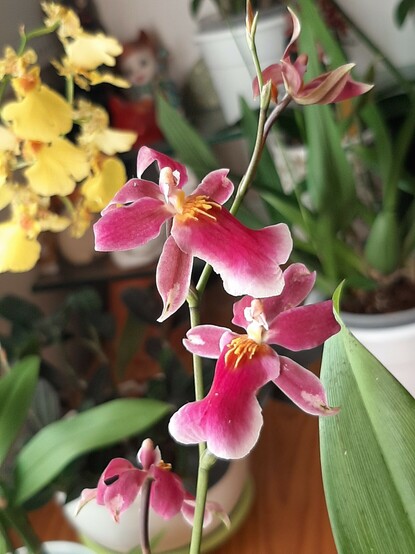 3 flowers came as a surprise on this Dendrobium orchid, because they appeared on a top of a half meter long old cane, which already bloomed before I got the plant, so I thought this was done blooming, but seems it thought otherwise 😍