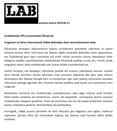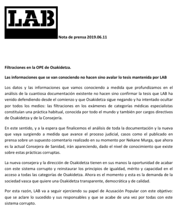 @LABsindikatua@twitter.com LAB va a seguir ejerciendo su papel de acusación popular con este objetivo: que se aclare lo sucedido y sus responsables y que se acabe de una vez por todas con este sistema corrupto