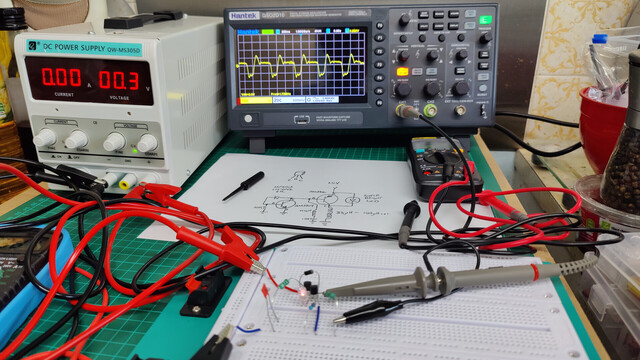 I've watched all the videos (164, to date) in this online electronics course, and have now gone back to the beginning in order to actually carry out the practical, hands-on exercises. Here I'm learning how to light an LED with less than half a volt. This "boost" circuit uses a similar principle to that used in switch-mode power supplies. It operates at about 1.7MHz and draws less than 2mA.