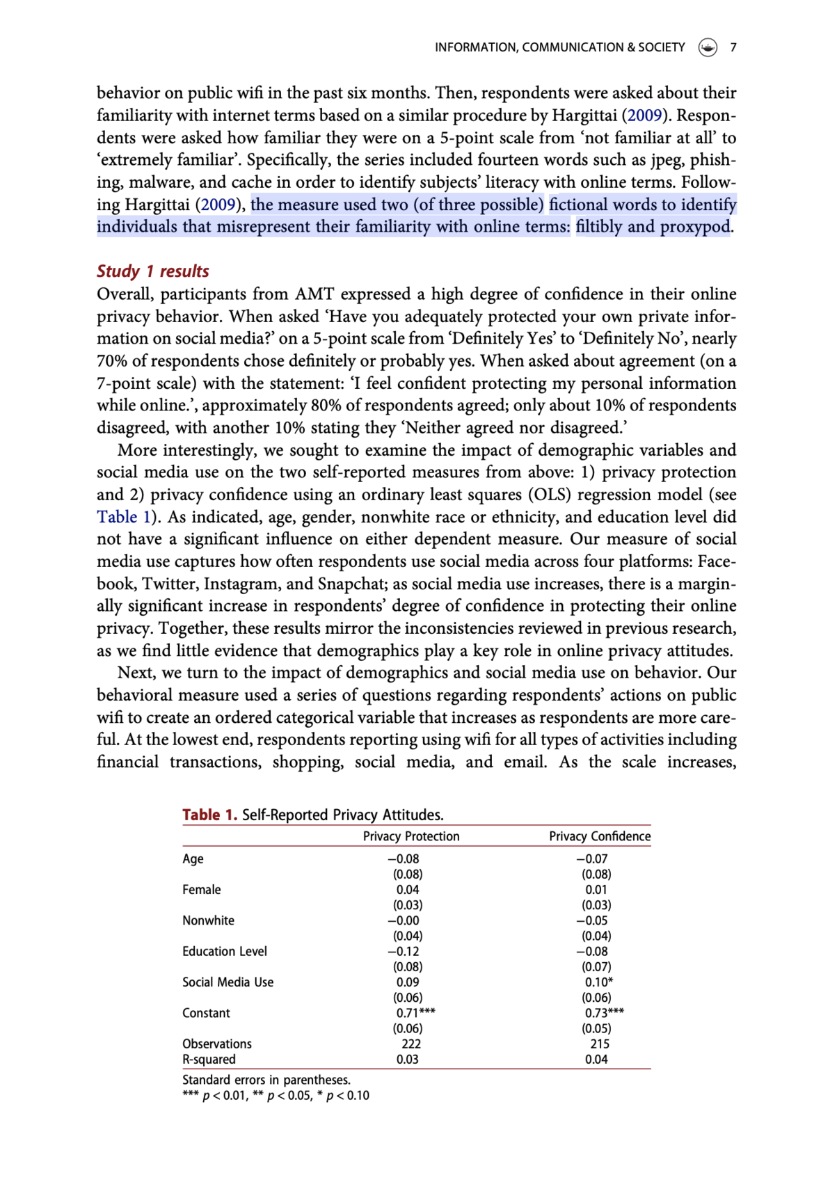 (1) Only among people who claimed familiarity with *fictitious* online privacy terms like 'filtibly' did self-reported carefulness on Public #Wifi correlate with their self-reported familiarity.