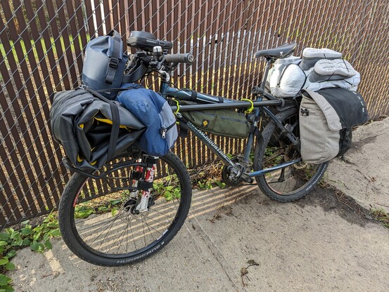 Here it is, my #BikePacking rig. Almost a #CarryShitOlympics contender. Would be a lot lighter without the #Packraft and related gear, but I'm determined to go boating on Astotin Lake tomorrow!