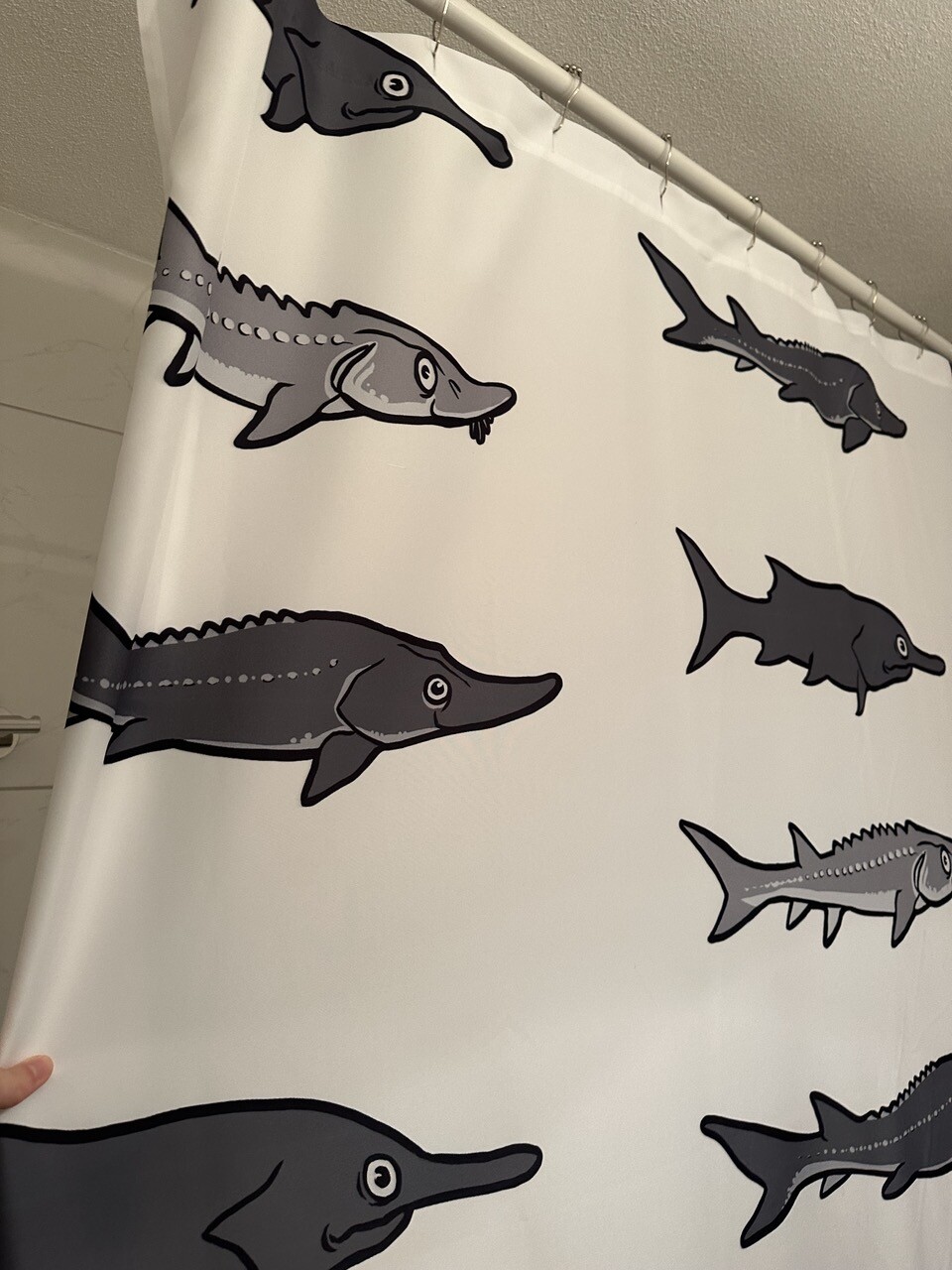 Someone actually ordered a shower curtain featuring my #sturgeon #paddlefish and #sturddlefish designs, and it turned out better than expected!