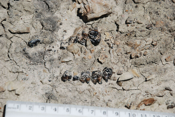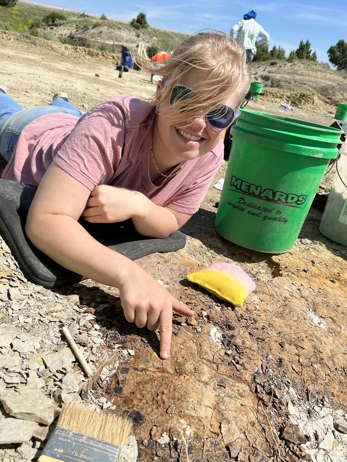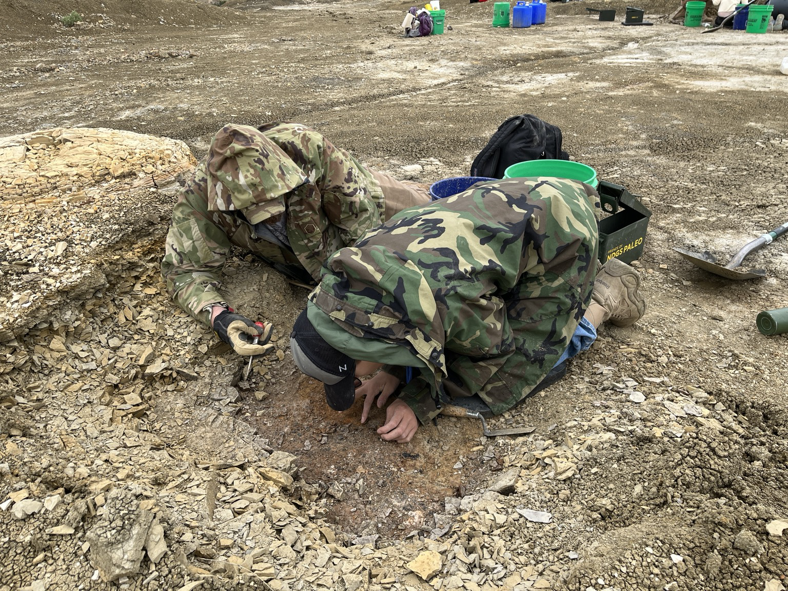 Ooooh I think we might be on the trail of our big crocodile Borealosuchus! Big belt-buckle sized osteoderm (skin armor) at the Medora, ND site.