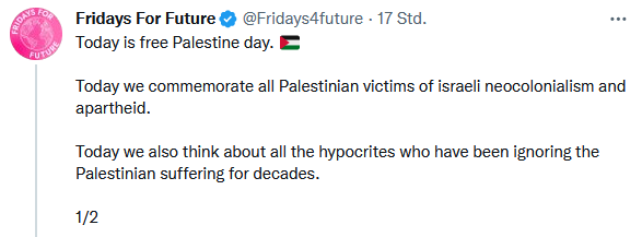 (@AmadeuAntonio) Zum #PalestineDay dichtet der Internationale FFF-Account einfach noch ein “free” dazu. Damit meint man aber nicht etwa “free Palestine from Hamas” - nein, stattdessen wird gegen das Existenzrecht Israels mobilisiert & israelbezogenem #Antisemitismus Tür und Tor geöffnet. 1/2 https://nitter.namazso.eu/AmadeuAntonio/status/1597923739286798336#m