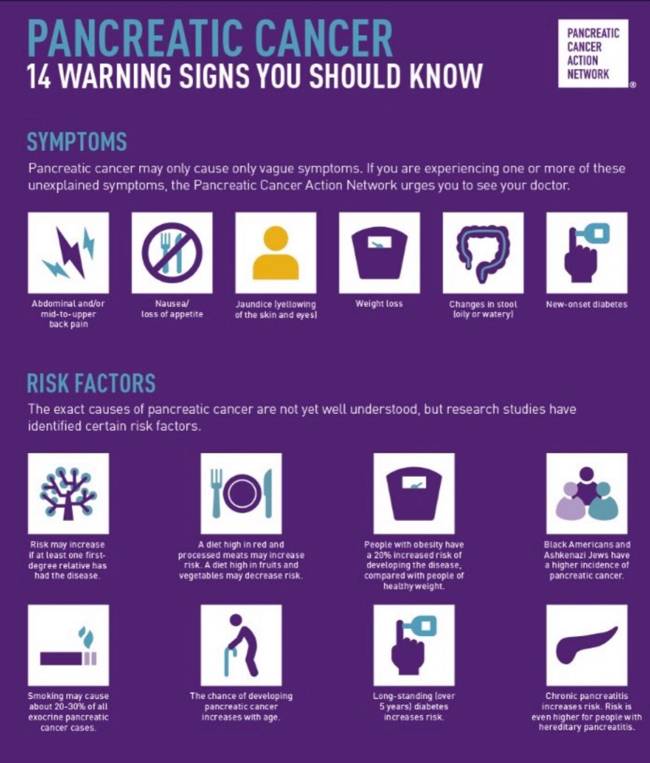#KnowTheSigns: abdominal/back pain, nausea, weight loss, stool change, jaundice, new onset diabetes. Family history too.