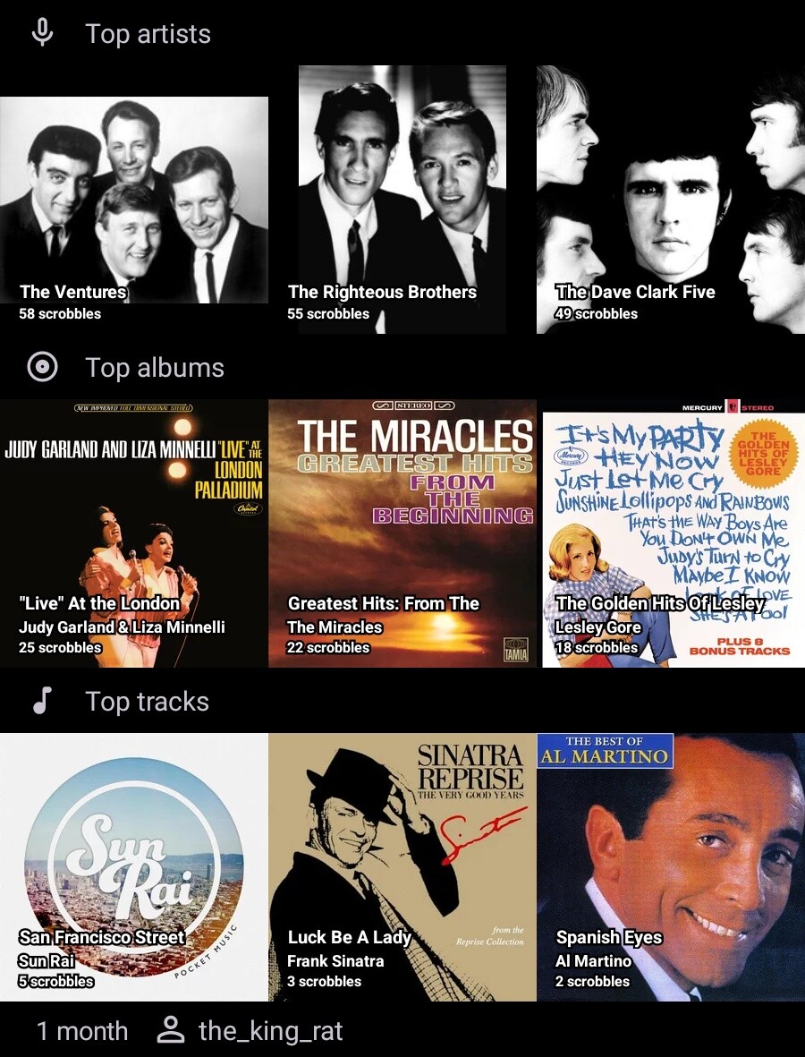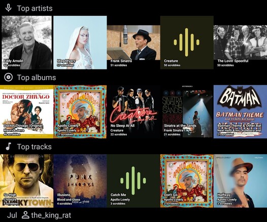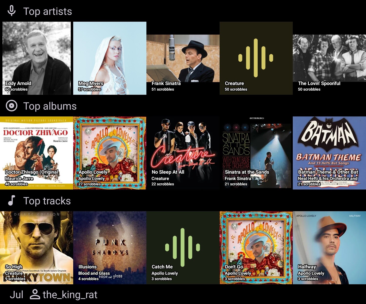In July I was listening to the top albums of 1966 and 1967. Hence the preponderance of Eddy Arnold and Frank Sinatra. But i also tried to assemble all my Creature related music too.