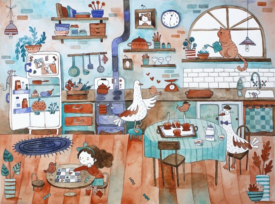 #illustration #illustrazione #acquere #watercolor #cute #papera #family #cucina #disegn #kidlit #illutrationonmastodon #animali #gatto