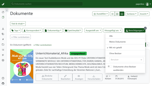 Nächster Testbereich: Benutzerverwaltung bei #paperlessngx - Ich möchte "Büro-Scans" von "Literatur-PDFs" getrennt aufbewahren. Klappt soweit gut, auch mit Teilen-Funktion usw. Lediglich unterschiedliche Dokumentenpfade muss ich noch definieren. Aber das sollte über die Variablen machbar sein.