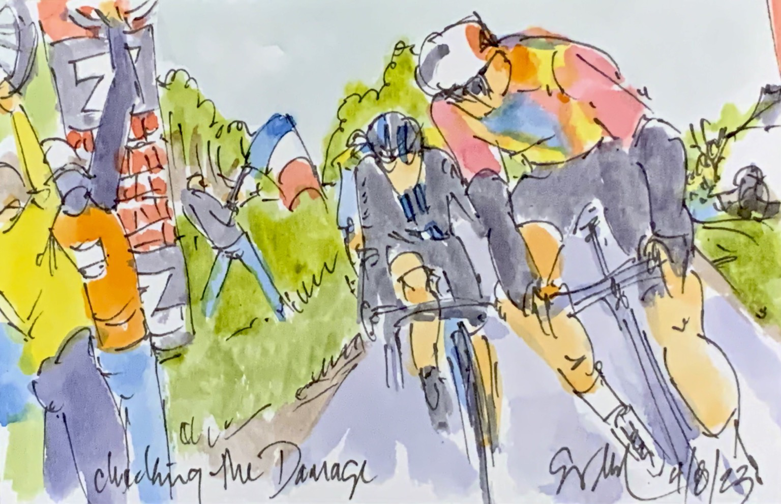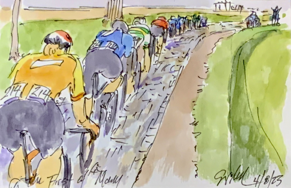 “Down in Front!” @ElisaLongoB @TrekSegafredo goes down in front of @LotteKopecky & @lorenawiebes @teamsdworx on #pave sector 9 (amongst others) @romykasper @agi_sou_qst stays upright. More #ParisRoubaixFemmes #cycling #art @ theartofcycling.blogspot.com #cyclisme #ciclismo #wielrennen #watercolors #watchthefemmes #chute #pave #womenscycling