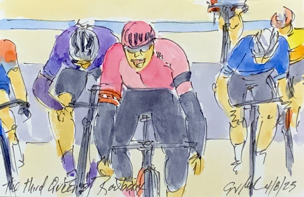 “Caught by the Peloton” Andersen of @UnoXteam looks back to see the #peloton catching her, Van ‘T Geloof @hphcycling & @romykasper @agi_sou_qst More @RoubaixFemmes #cycling #art #watercolors at theartofcycling.blogspot.com #cyclisme #ciclismo #wielrennen #ParisRoubaixFemmes #womenscyling #cyclingart