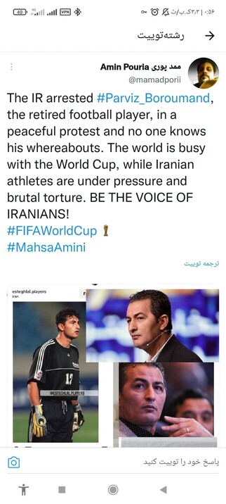 The IR arrested #Parviz_Boroumand, the retired football player, in a peaceful protest and no one knows his whereabouts. The world is busy with the World Cup, while Iranian athletes are under pressure and brutal torture. BE THE VOICE OF IRANIANS!