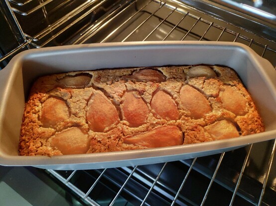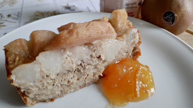 travasa in stampo oliato e guarnisci con 3 pere Angys o Abate tagliate in 8 fette