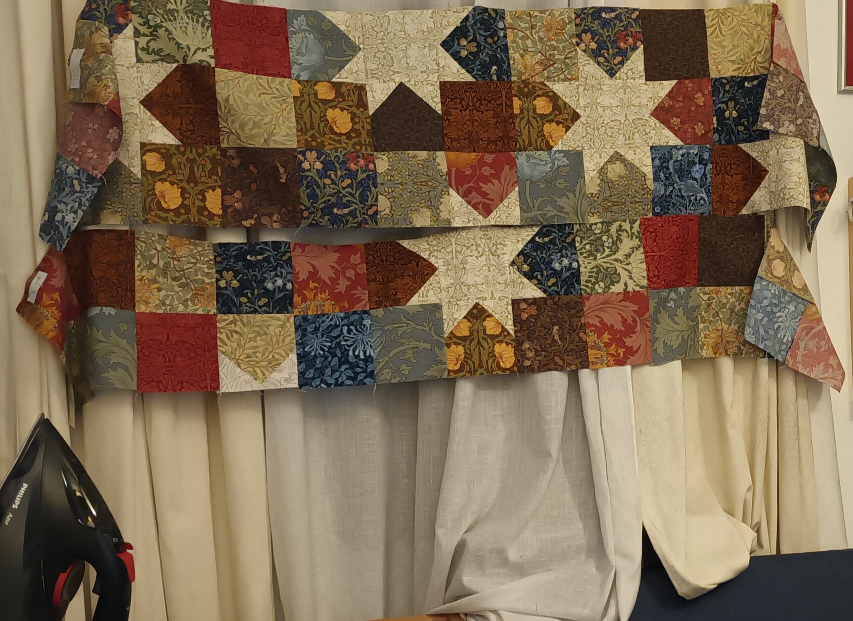 My "design wall" is basically pinning stuff to the curtains π #patchwork #quilting #PatchworkQuilt