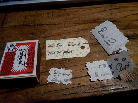 Estas son las cartitas que me deja ya sabes quien... pongo una cajita de fósforos para que aprecien el tamaño de microfilm que tienen... el otro día me dejó 3 juntitas una metida adentro de la otra... casi me pongo a llorar. Como crecen bo #paternidad #hijes