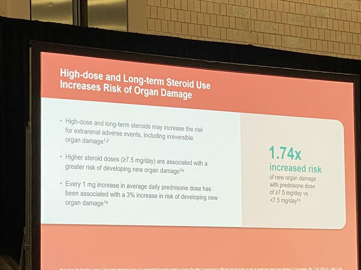 This is important! Patients with higher steroid (Prednisone, methylprednisolone, etc.) doses have a 1.74x INCREASED RISK of *new* organ damage. Reminder that we need to monitor disease activity more closely the higher our dose. #LupusChat #ACR22 #LADAOrg