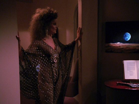 Stardate: 42859.2. While being escorted to a Federation conference by the Enterprise, Lwaxana hunts for a man to satisfy her needs when her sex-drive is quadrupled during a natural mid-life cycle.