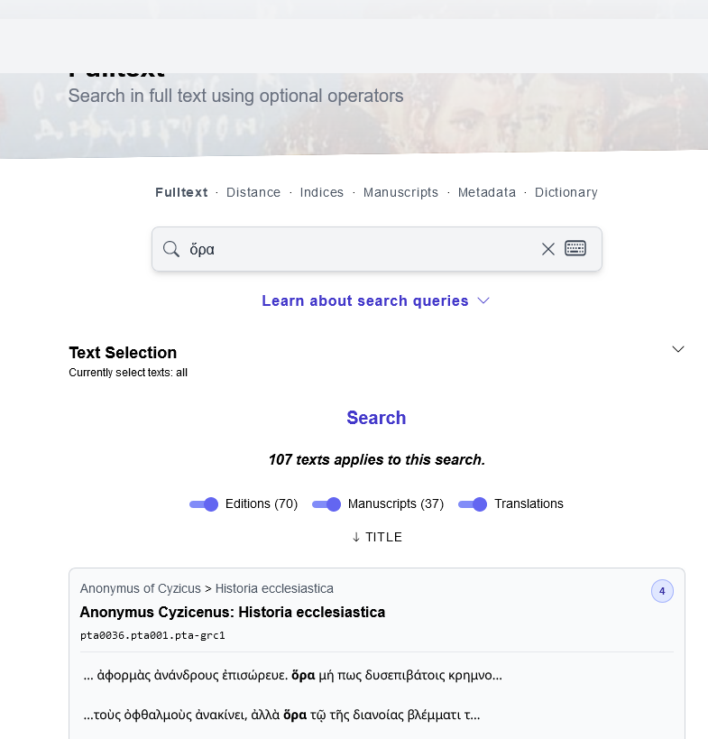 Look! You can now search faster and more reliable the texts in the #Patristic Text Archive. For example: Who's using ὅρα (“look”)? https://pta.bbaw.de/de/search/fulltext?q=%E1%BD%85%CF%81%CE%B1. Besides the fulltext search (based on regex, lemmatized coming soon), there's also a lemmatized distance search possible. @antiquidons