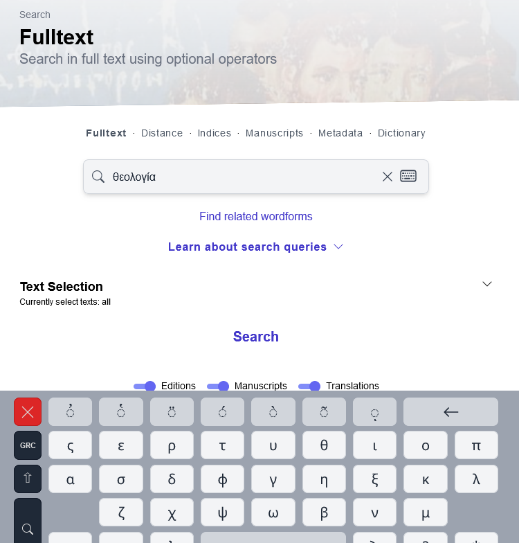 The #Patristic Text Archive has now also lemmatized fulltext search: For example, search for all forms of θεολογία in the Commentary on the Psalms of Eusebius of Caesarea: https://pta.bbaw.de/en/search/fulltext?q=%CE%B8%CE%B5%CE%BF%CE%BB%CE%BF%CE%B3%CE%AF%CE%B1+OR+%CE%B8%CE%B5%CE%BF%CE%BB%CE%BF%CE%B3%CE%AF%CE%B1%CE%B9+OR+%CE%B8%CE%B5%CE%BF%CE%BB%CE%BF%CE%B3%CE%AF%CE%B1%CE%BD+OR+%CE%B8%CE%B5%CE%BF%CE%BB%CE%BF%CE%B3%CE%AF%CE%B1%CF%82+OR+%CE%B8%CE%B5%CE%BF%CE%BB%CE%BF%CE%B3%CE%AF%E1%BE%B3+OR+%CE%B8%CE%B5%CE%BF%CE%BB%CE%BF%CE%B3%CE%AF%CE%B1%CF%82+OR+%CE%B8%CE%B5%CE%BF%CE%BB%CE%BF%CE%B3%CE%AF%E1%BE%B3&texts=pta0003.pta020 @antiquidons