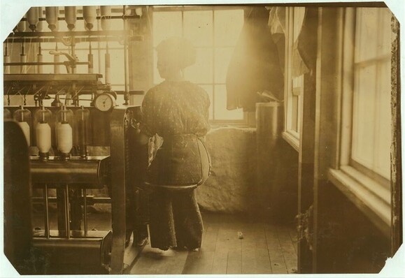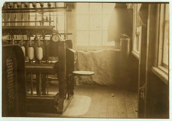 For Child Welfare Exhibit 1912-13.) Cotton-mill employee using seat that is on the end of her machine. #Pawtucket, R.I. Location: #Pawtucket, #RhodeIsland.