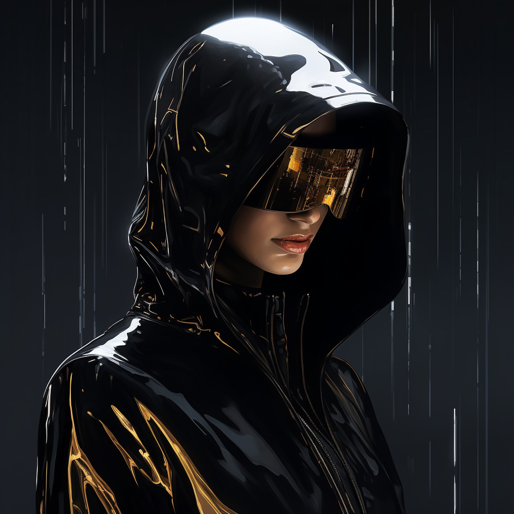Seraphina, known by her alias "Whisper," is a high-ranking operative within the Ghost Syndicate. She is a woman of mystery, always clad in a sleek, black trench coat that conceals her cybernetic enhancements. Her face is partially obscured by a visor that displays a cascade of digital code, making it impossible to discern her true identity.