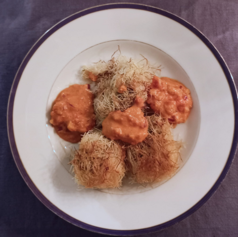In eine Schale etw. Butter, 1 Handvoll #Kadaifi, 1 Löffel Auberginencreme, darauf noch etw. Kadaifi + Butter. Ein Bällchen formen und das in eine Auflaufform geben (ca. 20 St.). Den Rest der Butter darauf verteilen + im Ofen 25 Minuten backen. #Ottolenghi #vegetarisch