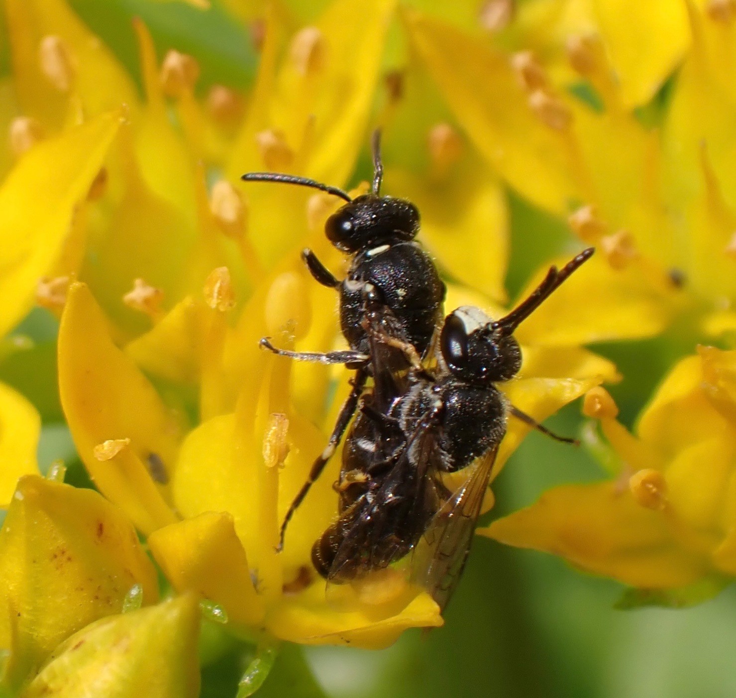 Mating pair of hairy masked bees, Hylaeus hyalinatus http://www.inaturalist.org/observations/169004149 … the day after #Pembroke1347 ’s May Ball.