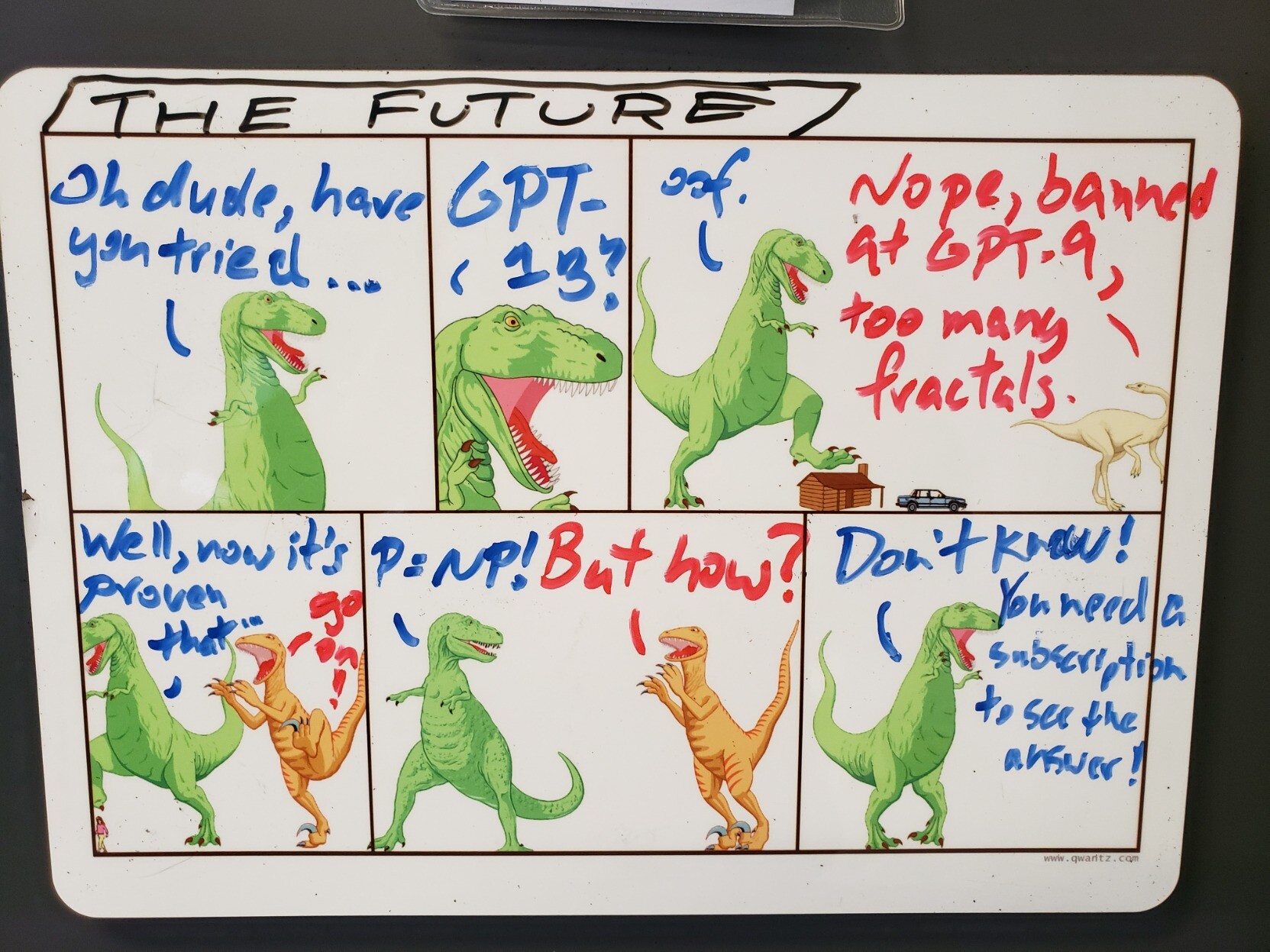 Dinosaur Comics board on my office door yesterday with a rare combo-joke from both courses I'm teaching this term and the last topics we were discussing in each. #computersciencejoks #machinelearningjoks #chatgpt #pequalsnp