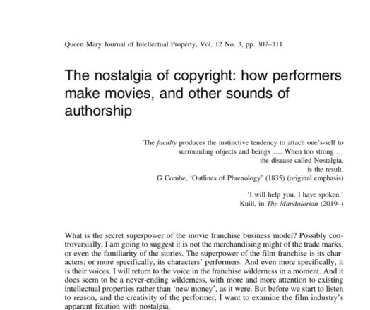 My latest piece “The nostalgia of copyright: how performers make movies, and other sounds of authorship” is now available in the Queen Mary Journal of Intellectual Property and it is free to access and download in the link below #FilmSound #Copyright #PerformersRights #Auteurism #TopGun #IntellectualProperty #LawProfs https://www.elgaronline.com/view/journals/qmjip/12/3/article-p307.xml