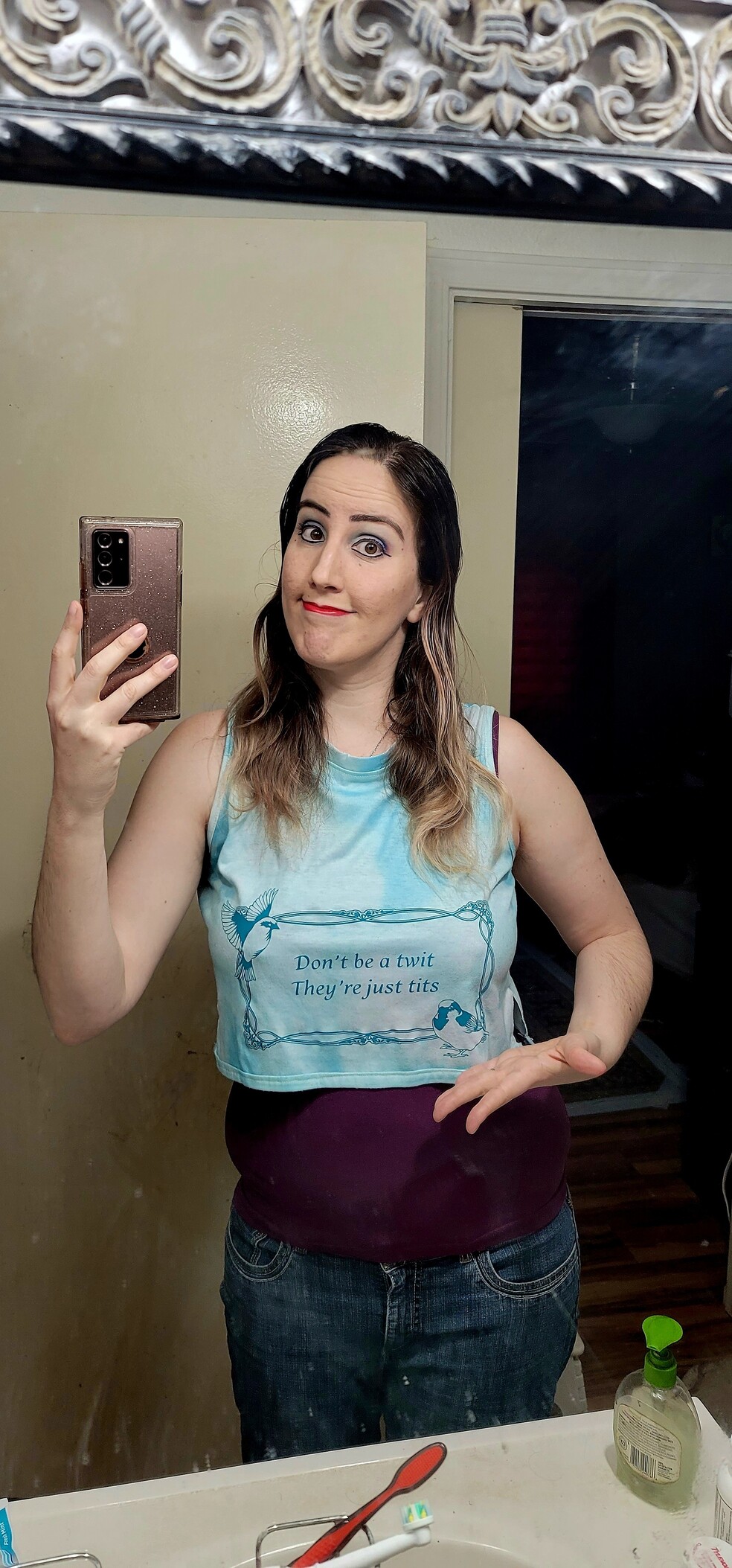 my "lewk" for Rachel Bloom's comedy show in #portland tonight. I still feel like I have no idea how to put on #makeup but I decided "go big or go home"... and of course I'm wearing my "don't be a twit, they're just tits" shirt 😜
