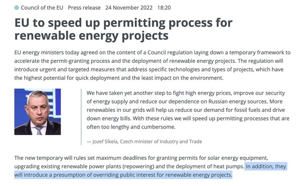Notable nugget: @EU_Commission doing what US Congress hasn't: Speeding up renewable approvals (q for @SabinCenter - would these be doable under US law without #permittingreform?) https://www.consilium.europa.eu/en/press/press-releases/2022/11/24/eu-to-speed-up-permitting-process-for-renewable-energy-projects