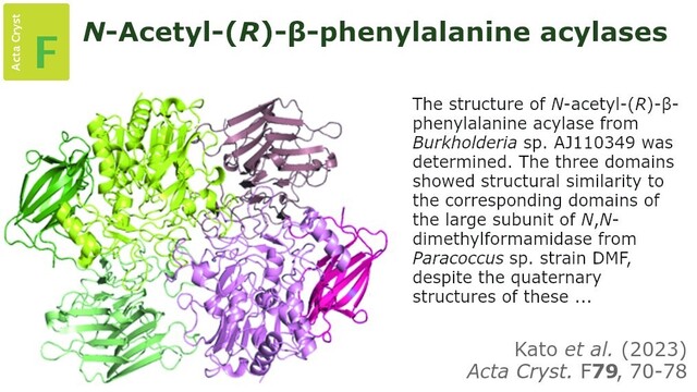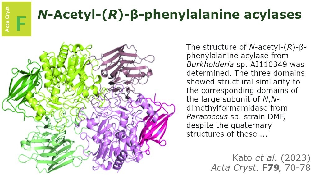Two N-acetyl-(R)-β-phenylalanine acylases were expressed and found to be dimeric in solution. One was structurally analyzed and compared with the large subunit of N,N-dimethylformamidase. #NAcetylRPhenylalanineAcylase #Phenylalanine https://doi.org/10.1107/S2053230X23000730