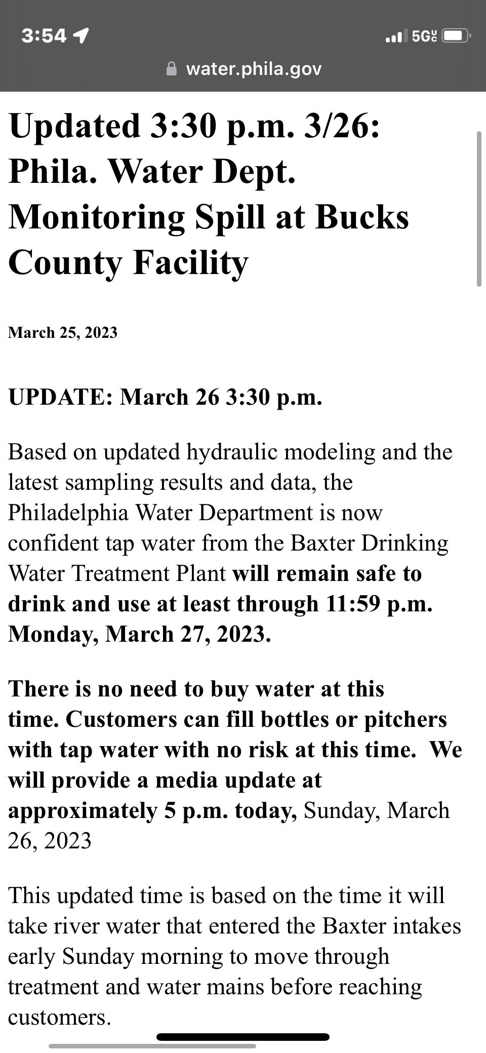 #PhiladelphiaWater Department is now confident tap water from the Baxter Drinking Water Treatment Plant will remain safe to drink and use at least through 11:59 p.m. Monday, March 27, 2023. There is no need to buy water at this time. https://water.phila.gov/drops/phila-water-dept-monitoring-spill-at-bucks-county-facility/ #philadelphia #water