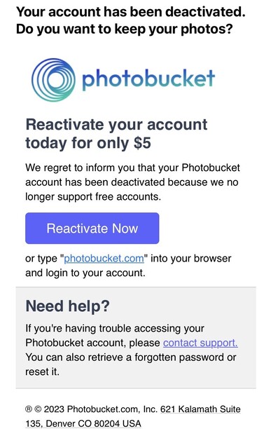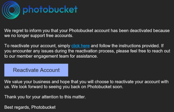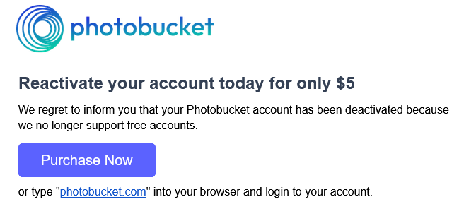 #Photobucket deactivated my free account without warning. Mind you I hadn’t used it in years, though I did download what few pics I had a few months ago. They said they dropped the free account. That’s their right, but it sure would’ve been nice if they’d given me a warning and time to download. Even if I hadn’t downloaded, I still had all those images. I did get emails my account was marked inactive but nothing about the free level going away. Jerks.