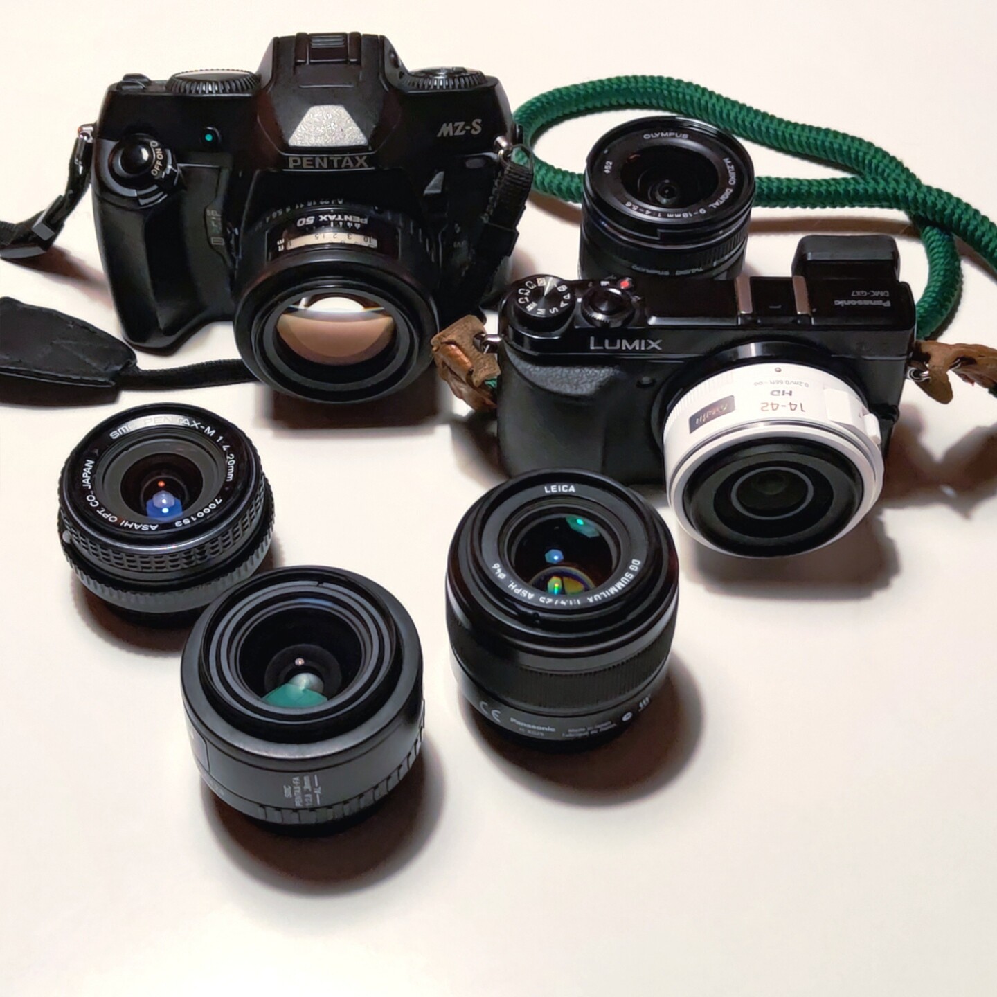 What's in my bag: Pentax MZ-S with some lenses, Panasonic GX7 with some lenses. I got everything covered! ☺️