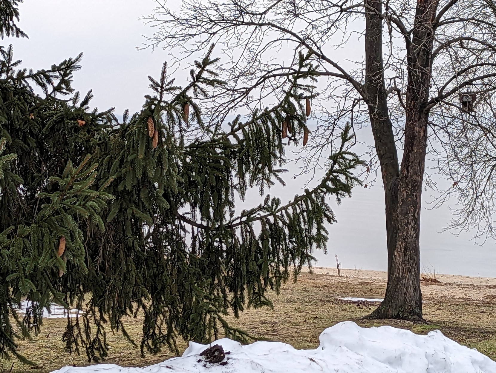 #SilentSundays #natureofmastoson #photography2023 #january large black spruce branches, bare maple branches and forked trunk on the right, some melting snow on the ground and beach behind, and misty gray water and sky behind