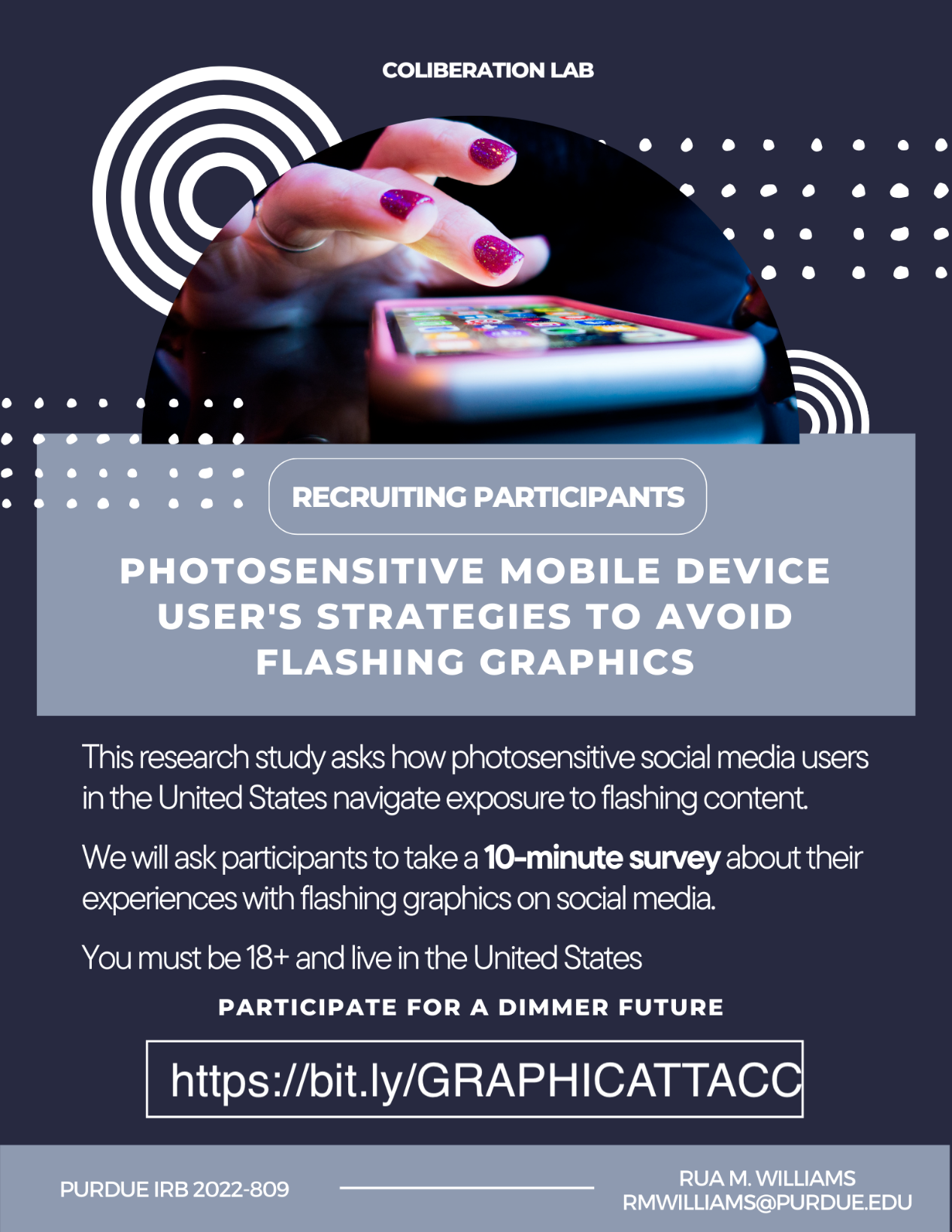 The Coliberation Lab, run by Rua M. Williams (@FractalEcho) at Purdue University, is recruiting participants for a short 10-minute survey about how photosensitive users navigate potentially dangerous flashing graphics on social media. 18+ & US residents only.