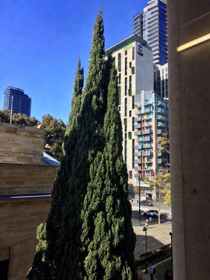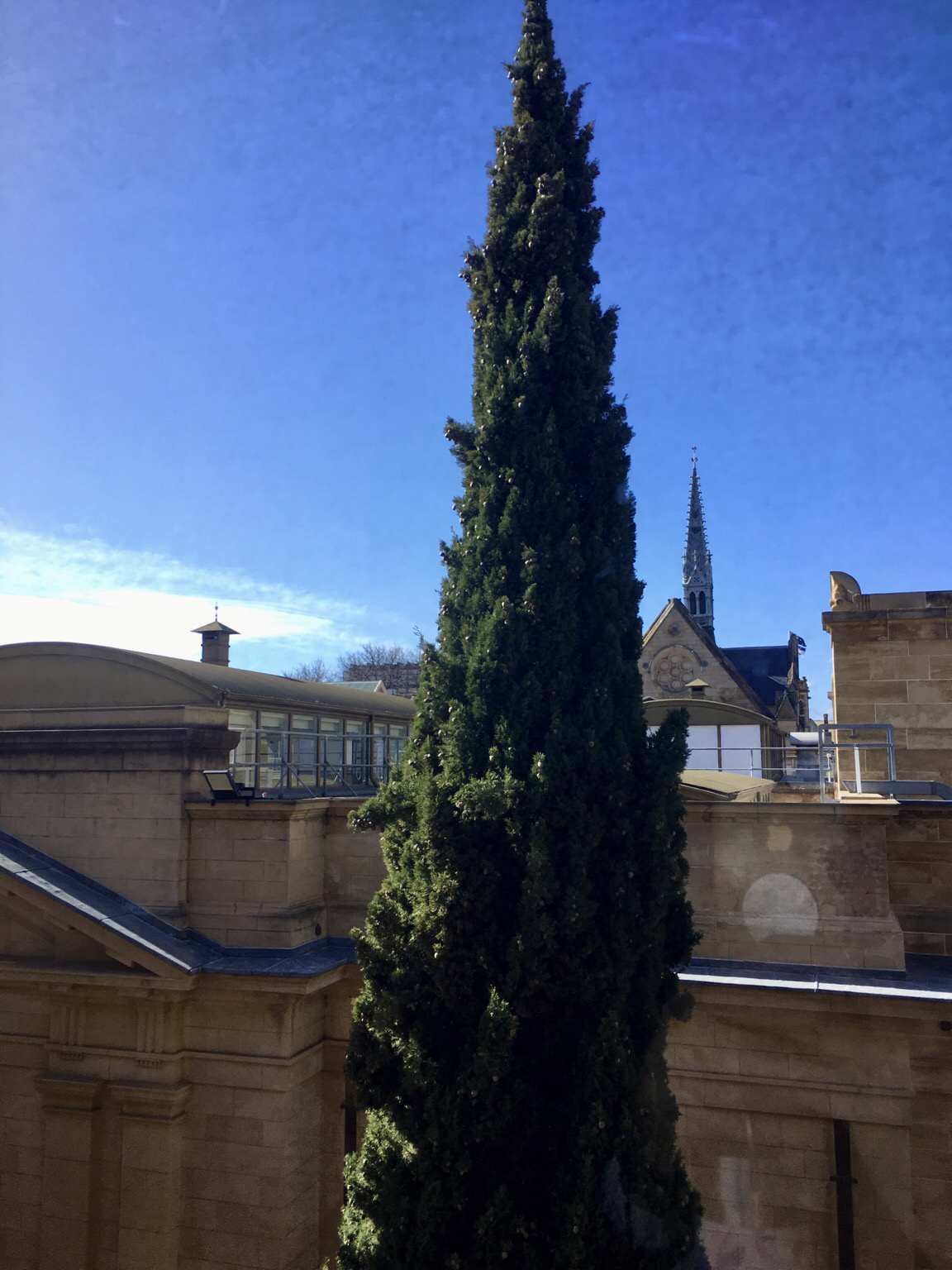 Another city shot, big beautiful Pencil Pine, standing tall against the solid lines of the constructed buildings behind. Contrast in every aspect. #City #Cityscape #Photos #PhotosOfMastadon
