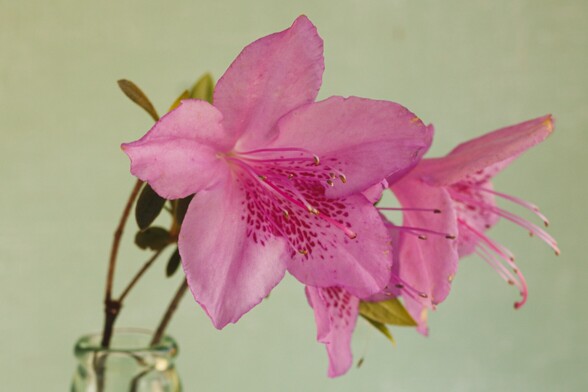 Day 6: A "studio portrait" of an azalea blossom in a vintage coke bottle.