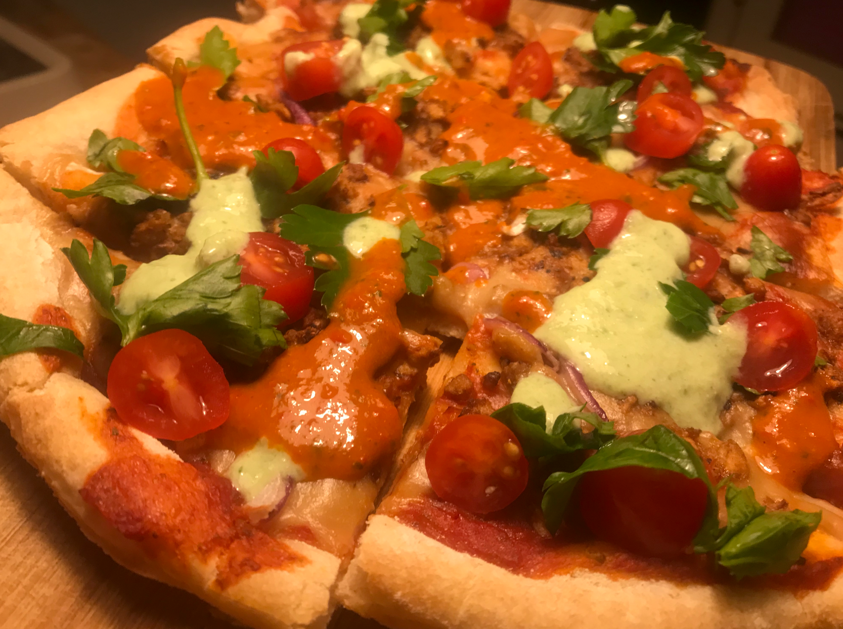 Gestern ein neues Lieblingsgericht entdeckt: Pinsa mit Sojahack, Petersilie, Tomaten, Chilli-Paprikacreme und Krätuercreme. 😍
