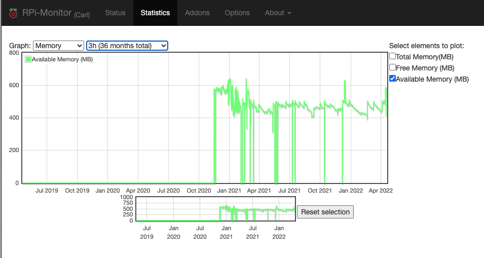 This is my #robot's available memory over the last three years - It rarely goes over 400MB used out of 800MB free, 200MB for #PiOS and #Python programs.