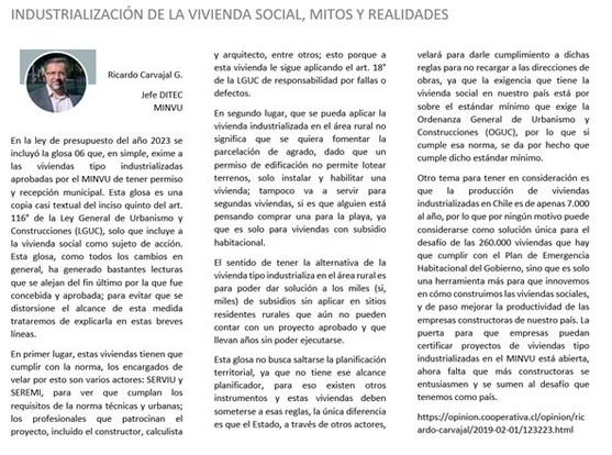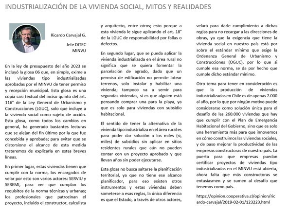 Comparto columna publicada en @Cooperativa en que aclaro los mitos de las viviendas tipo industrializadas del MINVU en el marco del #PlanEmergenciaHabitacional https://opinion.cooperativa.cl/opinion/urbanismo/industrializacion-de-la-vivienda-social-mitos-y-realidades/2022-12-13/113402.html