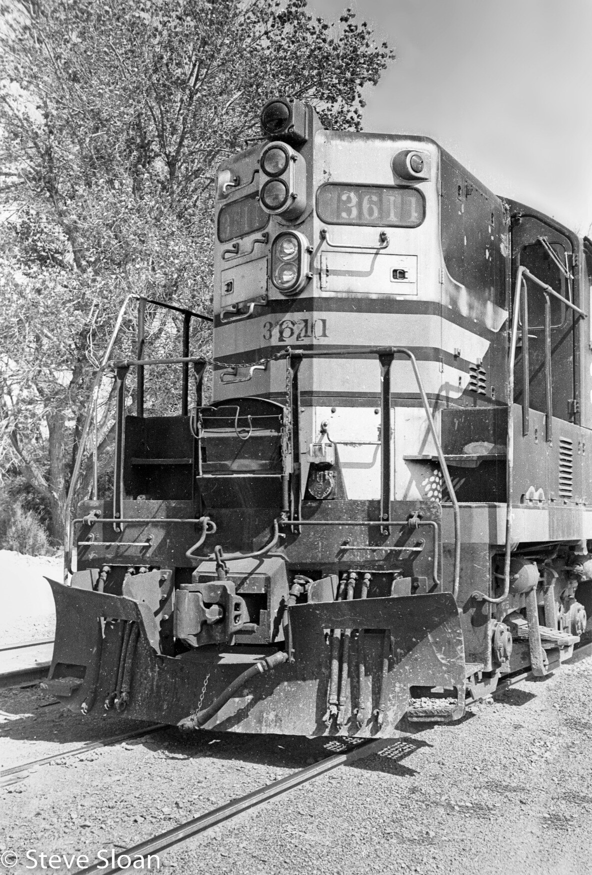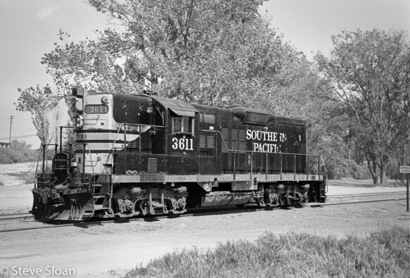 Southern Pacific (SP) Black Widow GP9 3611 was one of the last black and silver units in service. It spent awhile working the East Pleasanton job, laying over in perfect light, on an unrecorded date in 1973.